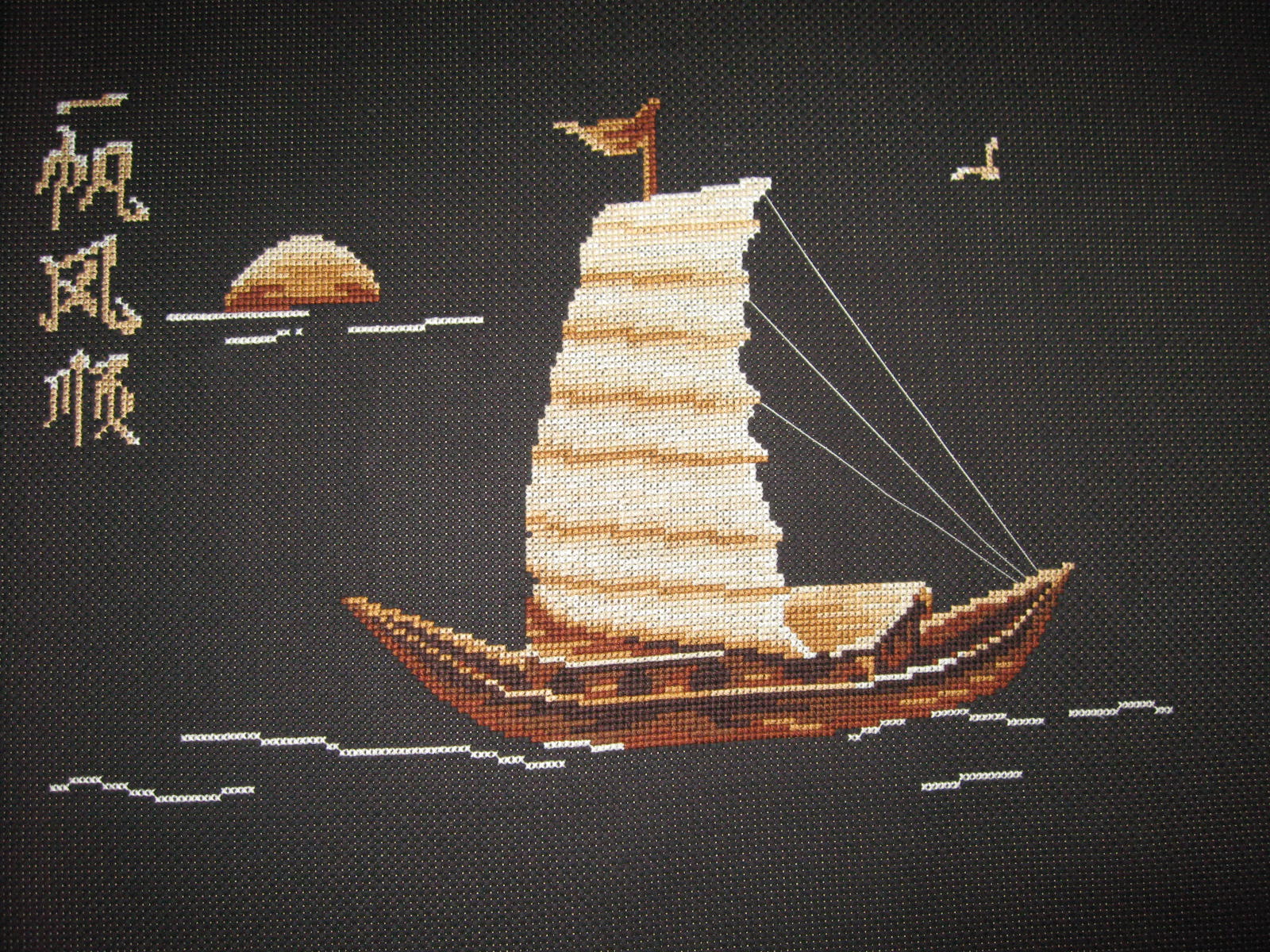 Отвечая на вопросы рукодельного флешмоба от Юляшки, вспомнила о своем долгострое. Осенью начала лодочку и как-то забросила. Вот лодочка готова, пока без рамки, буду оформлять в багетке, размер 40 на 50 см. Канва в китайском наборе очень крупная, пришлось вышивать в три нити.